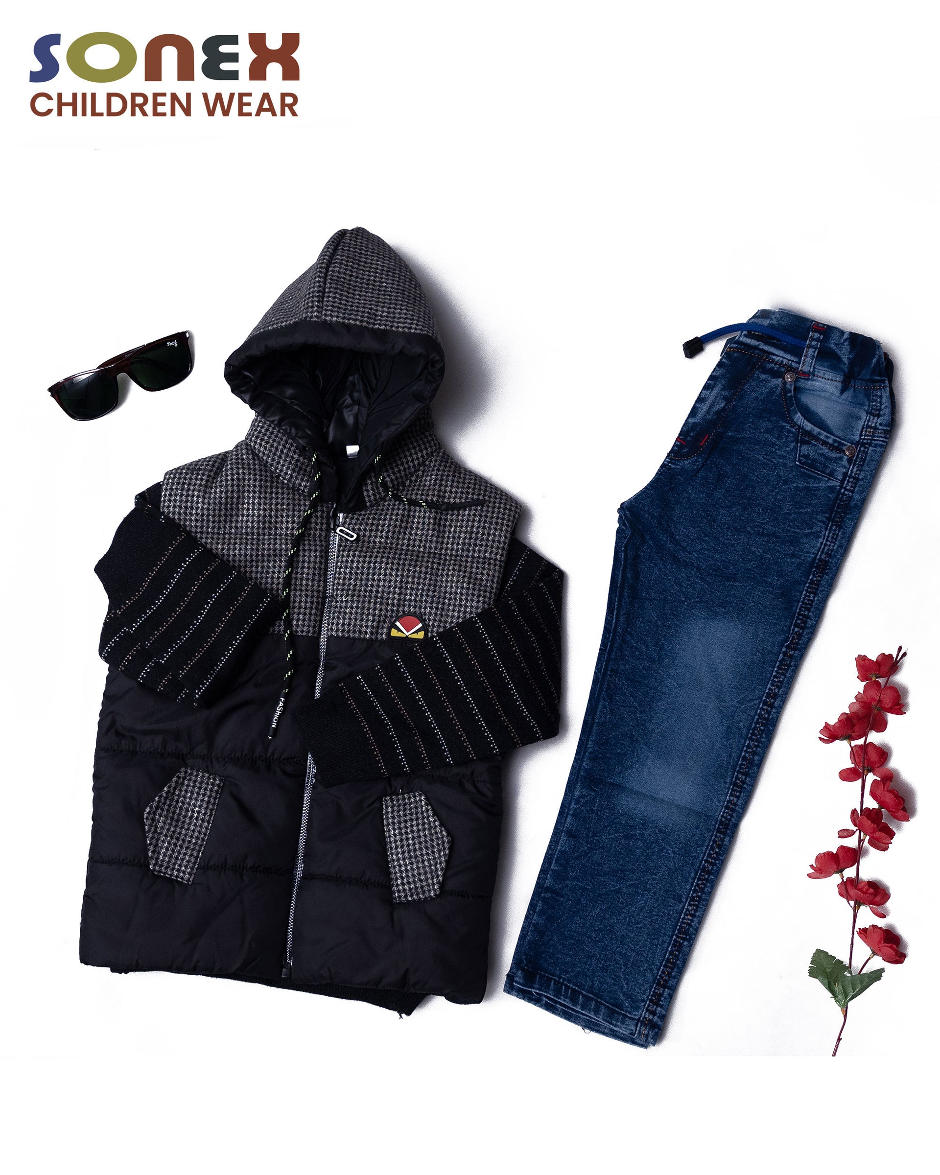 Update your child's wardrobe with this stylish Black Sweater & Jacket paired with classic Jeans. The perfect combination of fashion and functionality, keep your little one warm and in style. Made with quality materials, this set is sure to be a staple in their closet.