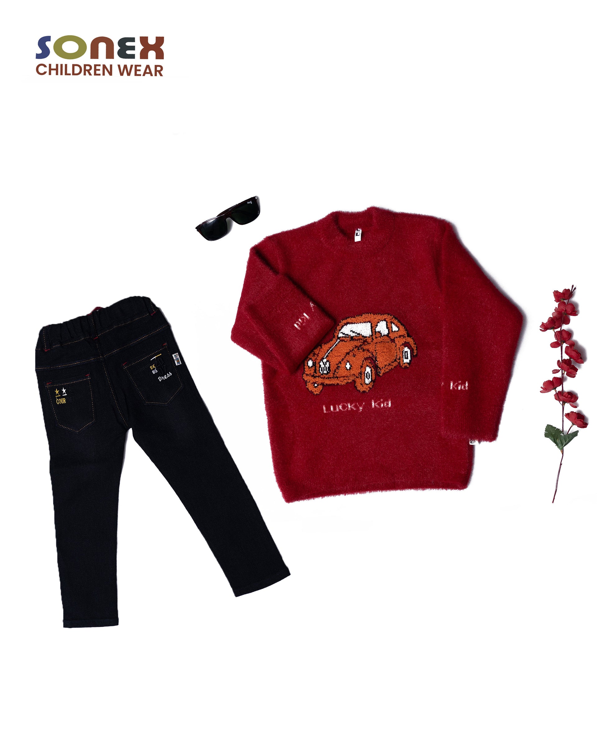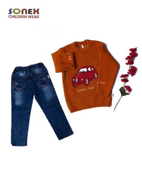 Keep your child warm and stylish with this cozy sweater available in vibrant orange and red, paired perfectly with classic blue jeans. The soft fabric of the sweater ensures comfort, while the bold colors add a fun pop to any outfit. Ideal for casual outings or playdates, this set combines comfort and style effortlessly.