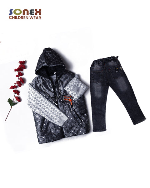 This stylish winter set includes a hooded jacket with intricate sleeve patterns, perfect for staying warm while looking fashionable. The gray and black color scheme gives a cool look, while the denim jeans add a...