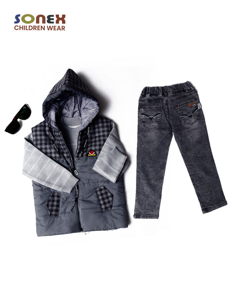 Dress your child in style with this sleek grey bomber jacket and matching grey jeans. The bomber jacket offers a trendy look with a comfortable fit, while the jeans provide flexibility for play. Ideal for everyday wear or special occasions, this outfit keeps your little one fashionable and cozy.