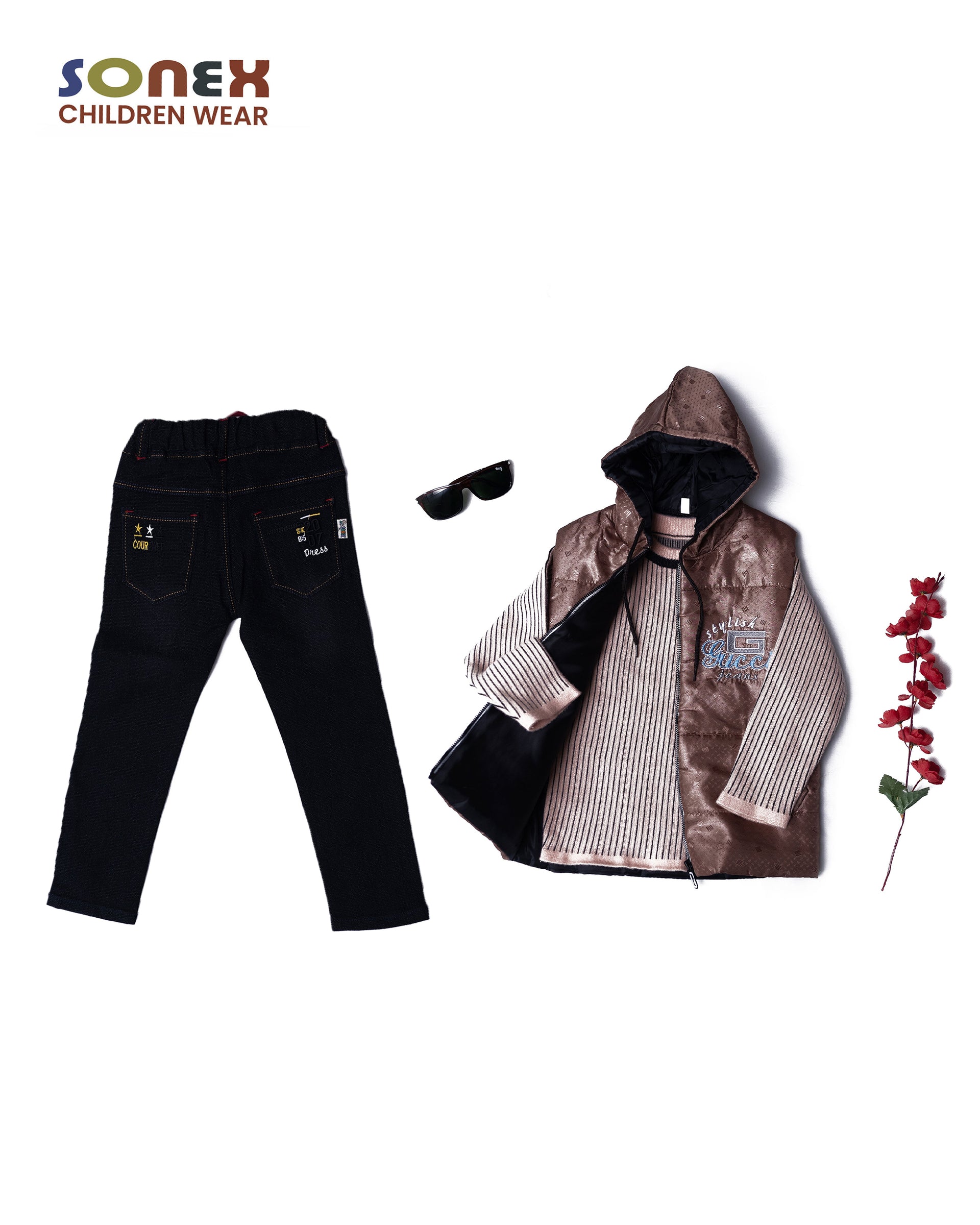 Elevate your child’s style with this sophisticated leather brown jacket paired with a cozy sweater and classic jeans. The leather jacket adds a rugged touch, while the sweater provides warmth and comfort, making it perfect...