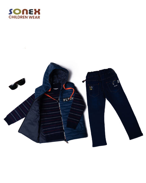 This stylish dark blue jacket, designed for comfort and warmth, pairs perfectly with classic jeans for a trendy look. The jacket features a cozy hood and a sleek design, making it ideal for chilly days....