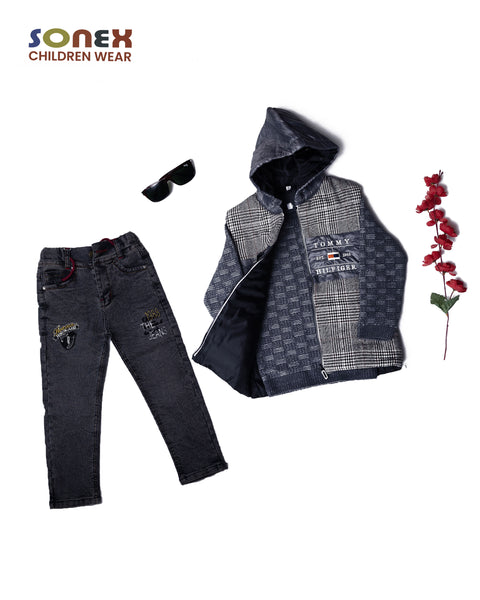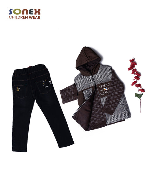 Upgrade your child's wardrobe with this stylish Tommy Hilfiger jacket and sweater set in a chic combination of brown and sky blue. The jacket features a classic design with the iconic Tommy Hilfiger logo, while the soft sweater offers comfort and warmth for chilly days. Perfect for casual outings or school, this fashionable ensemble ensures your little one stands out in style.